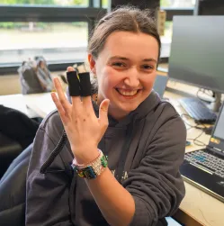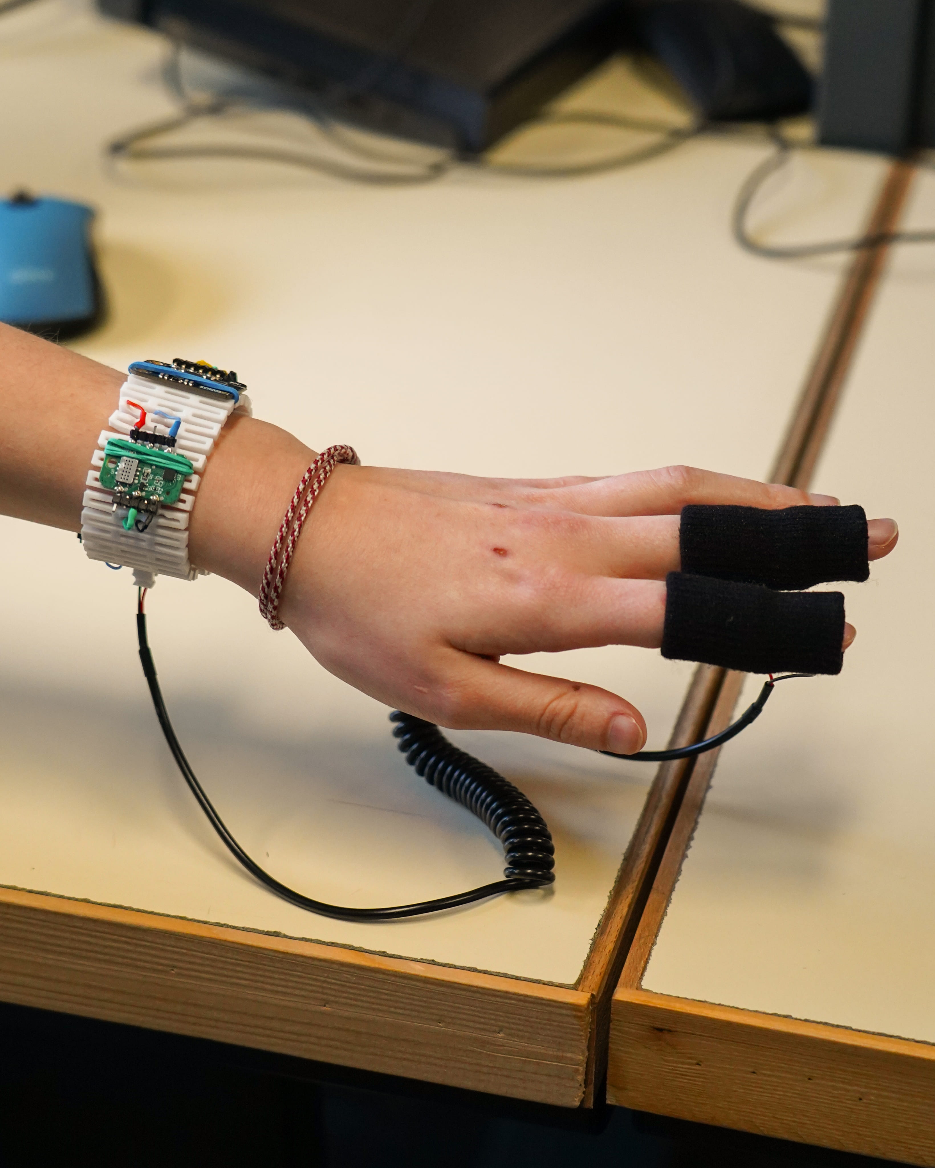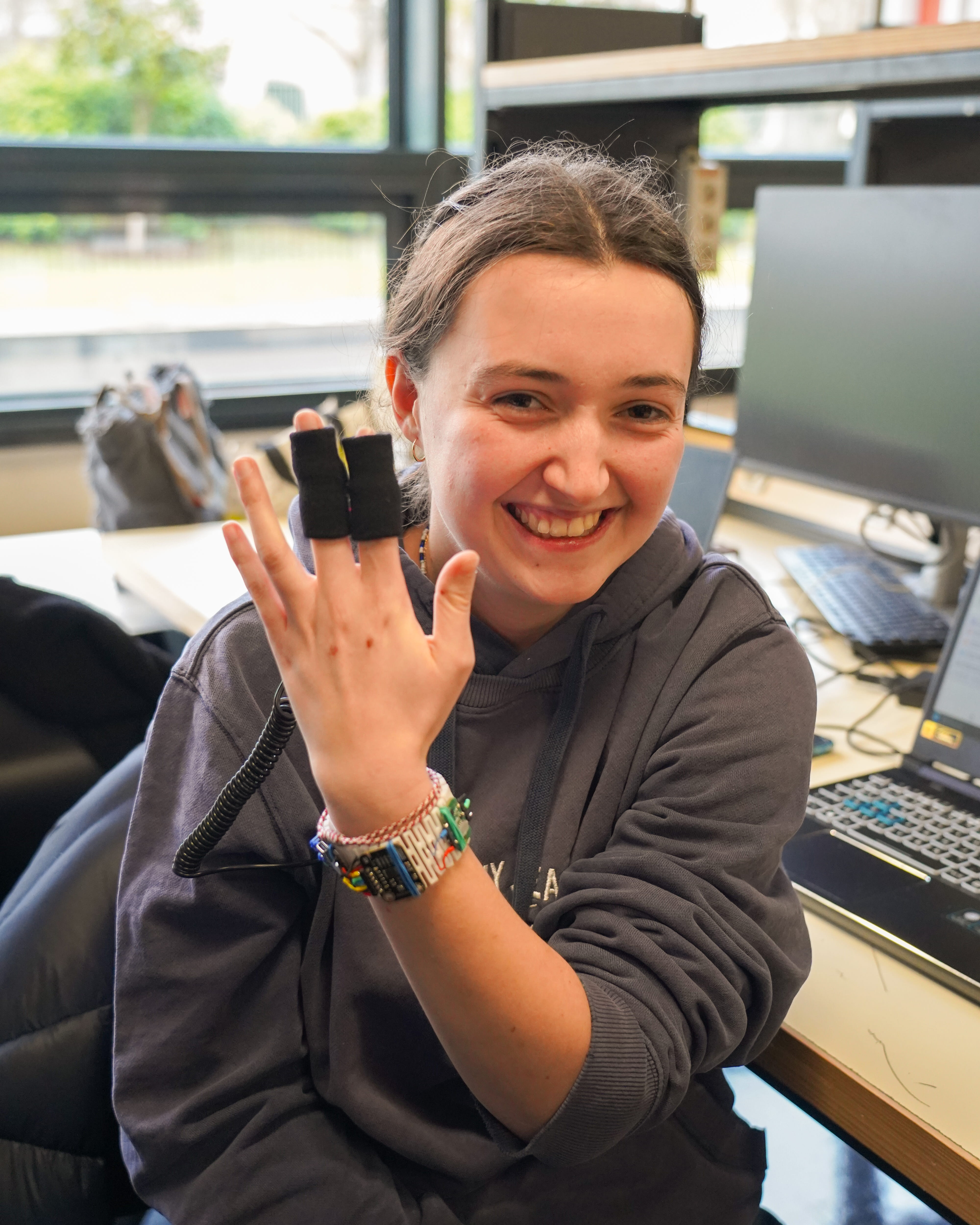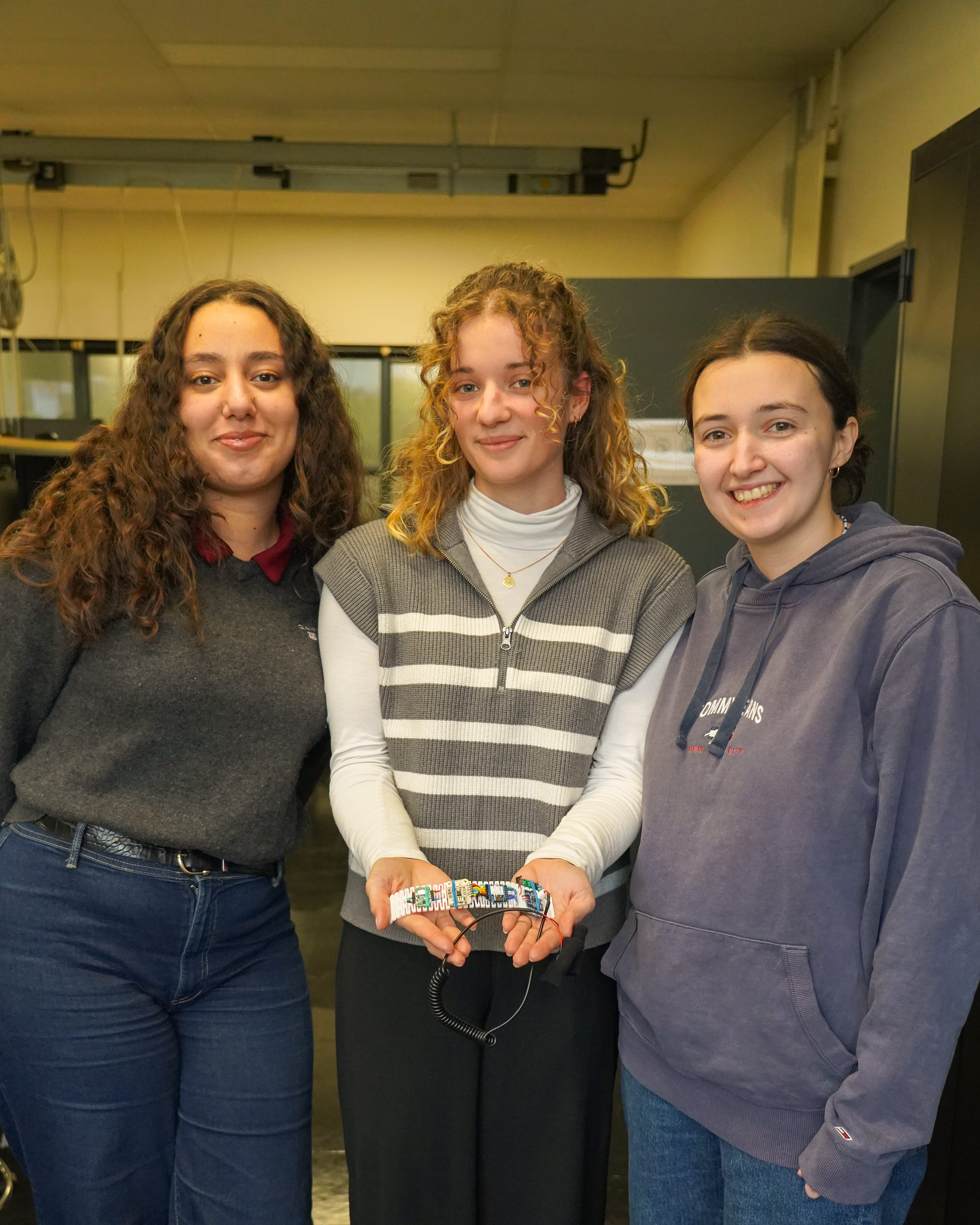 Parmi ces projets, celui de 𝗠𝗮𝗲̈𝗹𝗹𝗲, 𝗔𝘁𝗵𝗲́𝗻𝗮𝗶𝘀 𝗲𝘁 𝗥𝗶𝗵𝗮𝗯 se distingue par son engagement au service des personnes souffrant d’asthme. Leur bracelet connecté intègre plusieurs capteurs (pollution de l’air, fréquence cardiaque, oxygénation du sang), réunis dans un système compact respectant des contraintes de compatibilité électromagnétique.