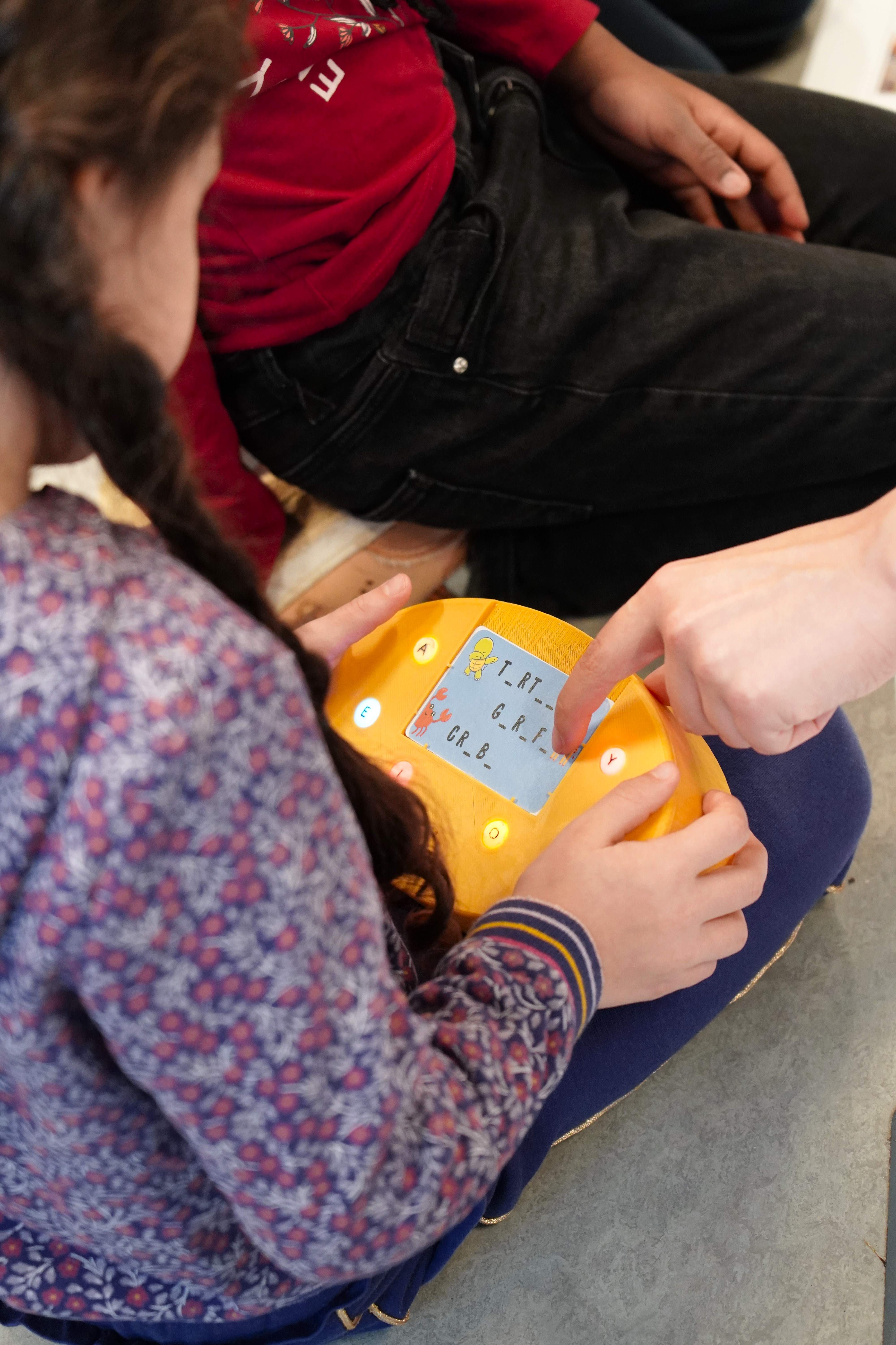 Centrée utilisateur, la première consiste en une console électronique musicale et ludique adaptée aux tout-petits. L’utilisateur peut y insérer une carte correspondant à un animal dont le nom s’affiche ensuite à l’écran – sans les voyelles. Le but de ce serious game est de compléter le mot avec les bonnes lettres !