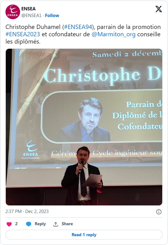 La cérémonie de Remise de Diplômes a eu lieu aujourd'hui, en présence de Laurence Hafemeister, Directrice Générale de l'ENSEA, Ludovic Danjean, Président d' ENSEA Alumni, et Christophe Duhamel (#ENSEA94), parrain de la promotion et cofondateur de Marmiton.