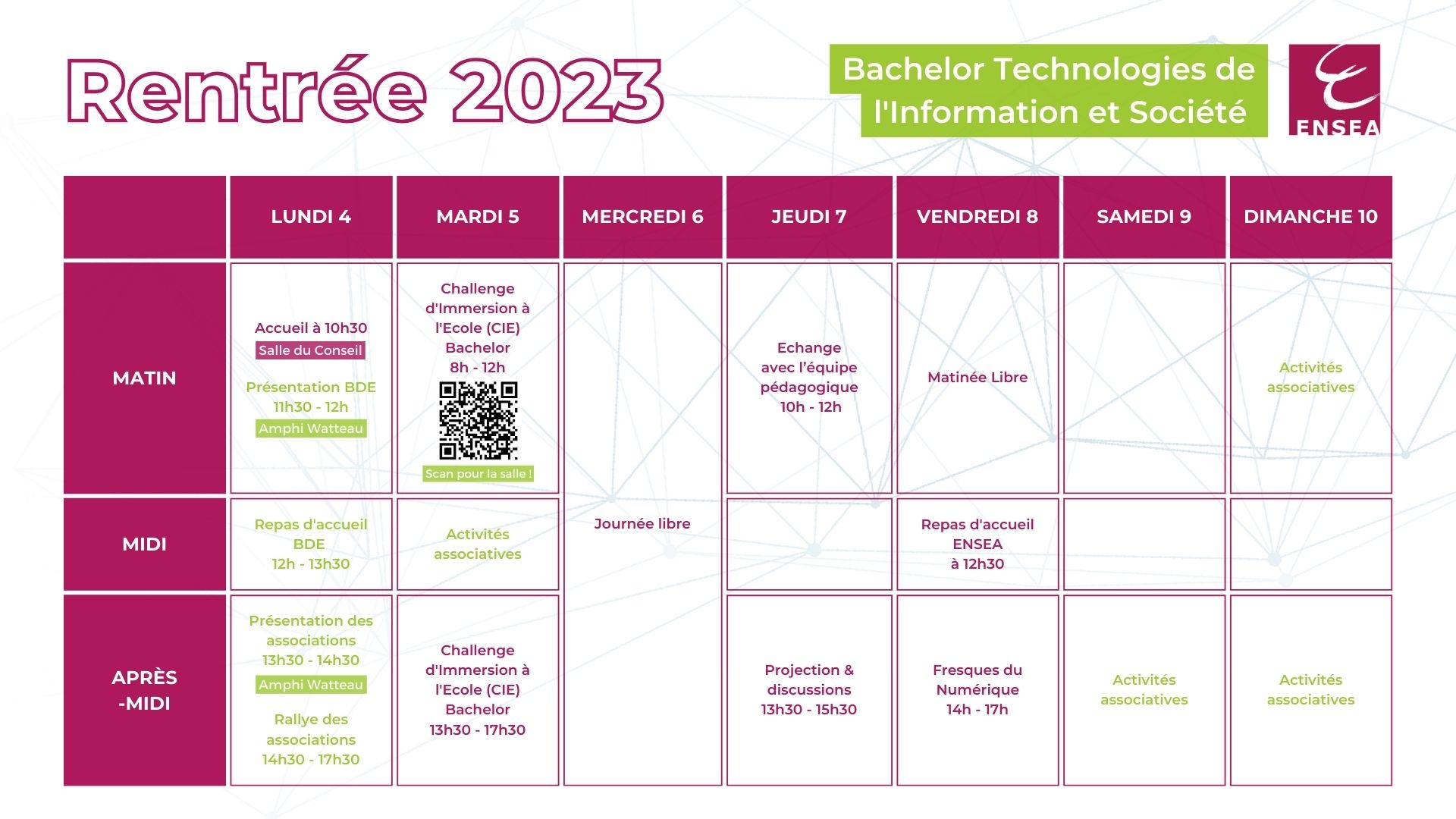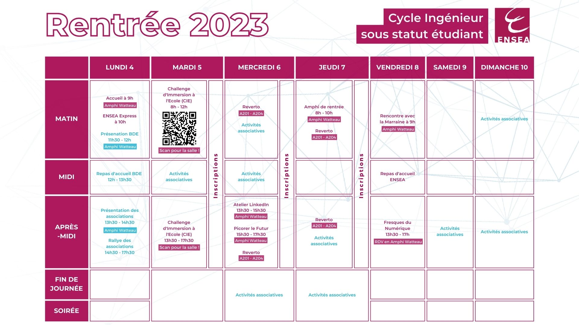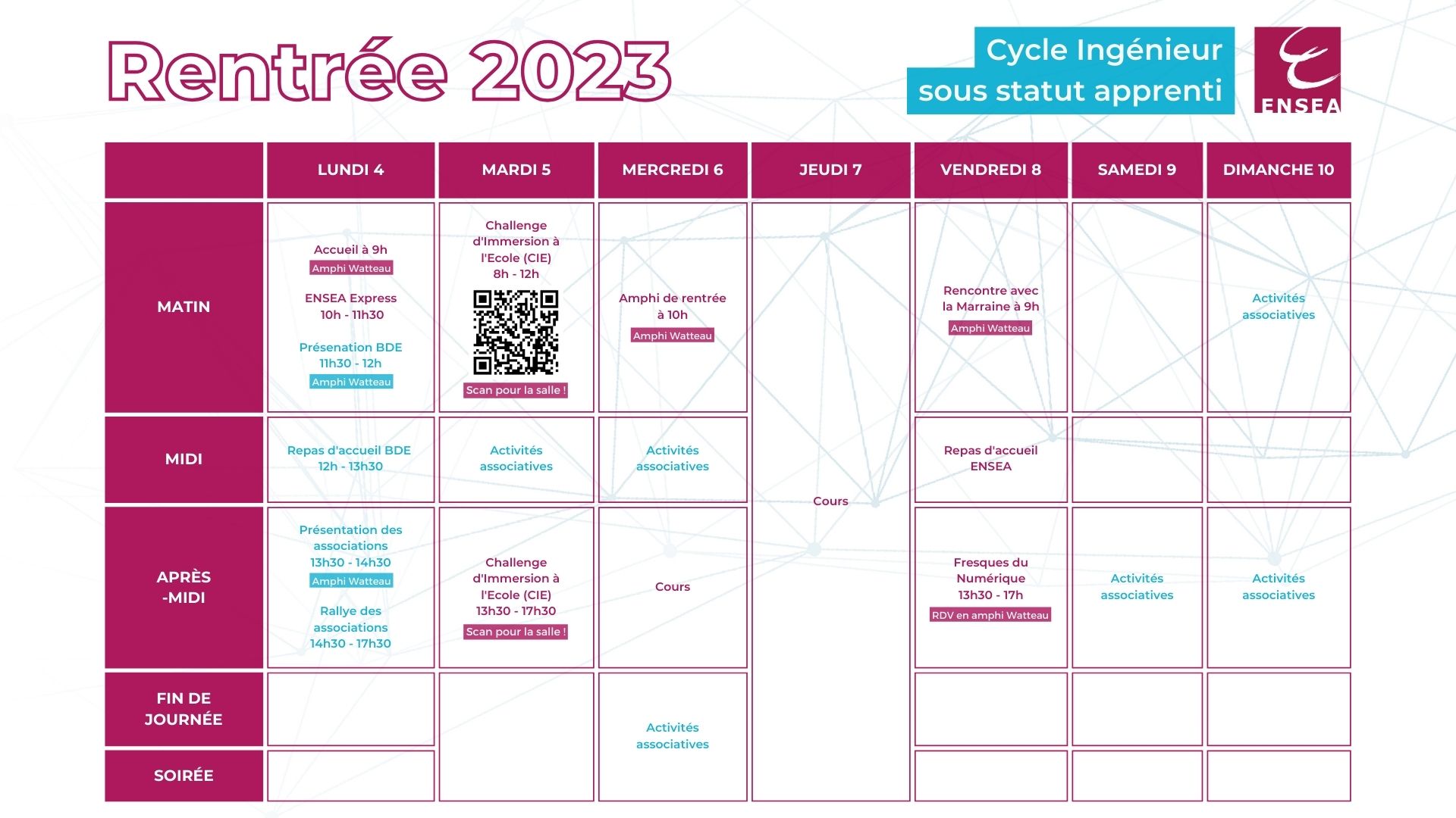 Pour aborder votre parcours ingénieur, nous vous proposerons à votre arrivée en septembre un accueil d'une semaine d’exploration de différents aspects du métier d’ingénieur. Ainsi vous participerez en équipe à des ateliers de découvertes et à un projet d’immersion vous permettant d’interagir avec des étudiants de l’école et des ingénieurs en poste, et de découvrir la richesse de l’environnement de travail et du cadre de vie dans l’ENSEA (laboratoires, services, encadrement, FabLab, plateformes numériques, échanges internationaux, associations étudiantes, doubles diplômes…).