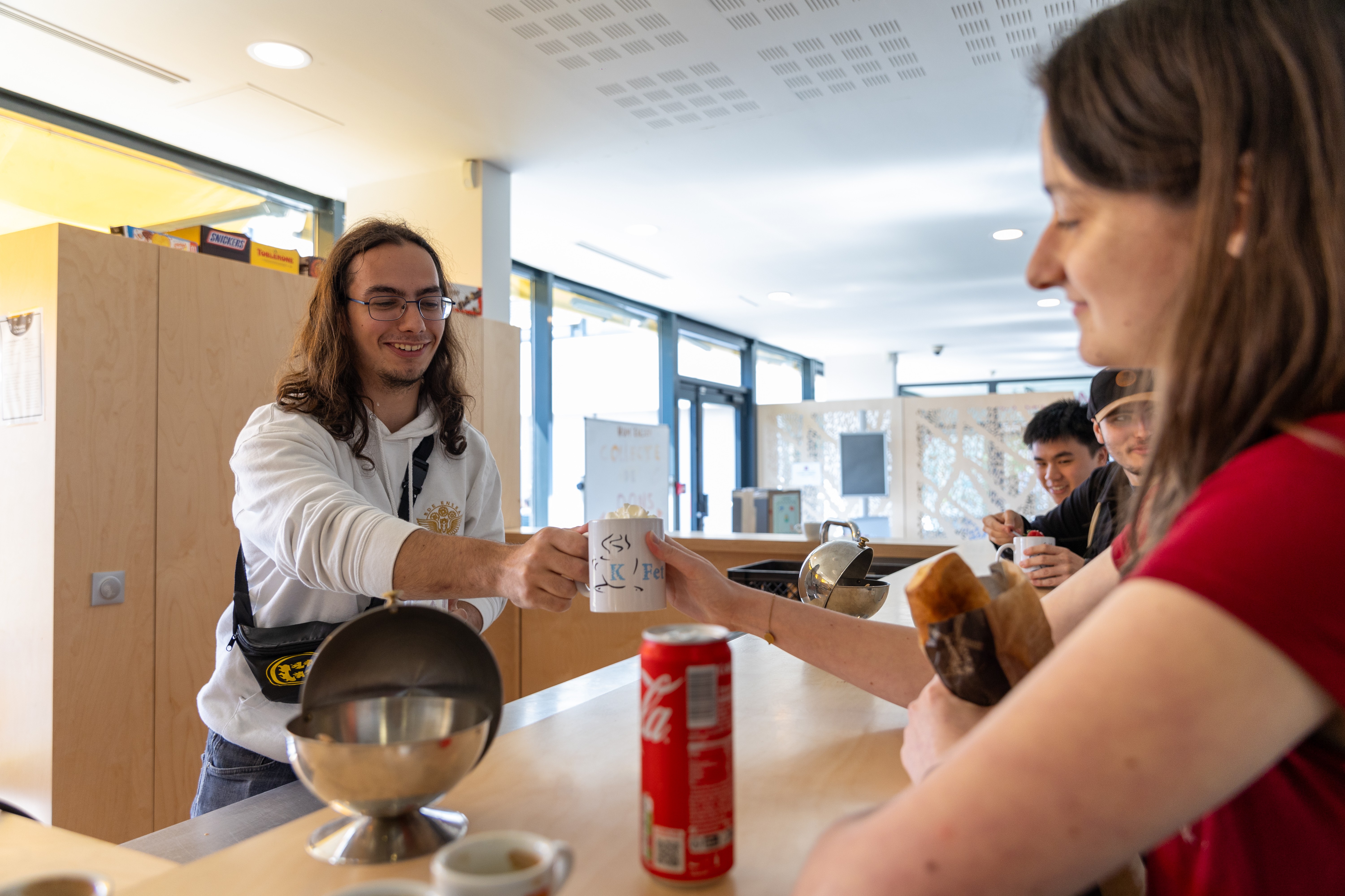 Ce sont les étudiants qui s'en occupent sur la base du volontariat. Certaines semaines, une association en prend les rênes et te prépare de bons petits plats : ce sont les fameuses semaines Kfet !