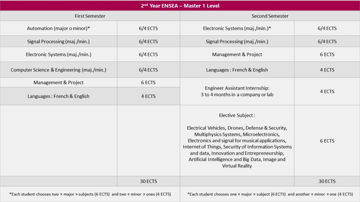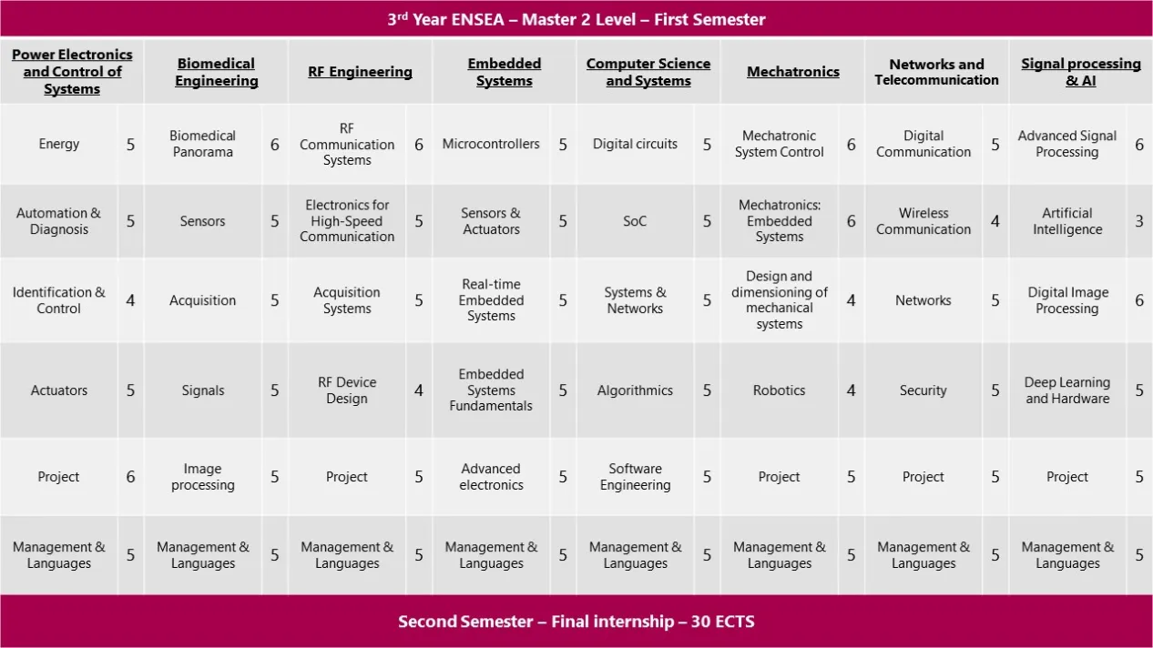L’ENSEA propose un large choix de de modules d'apprentissage avec un parcours très progressif vers la spécialisation. Voici un aperçu de notre offre académique principale durant les années de cycle ingénieur (deuxième et troisième année), période pendant laquelle nous accueillons généralement nos étudiants internationaux :