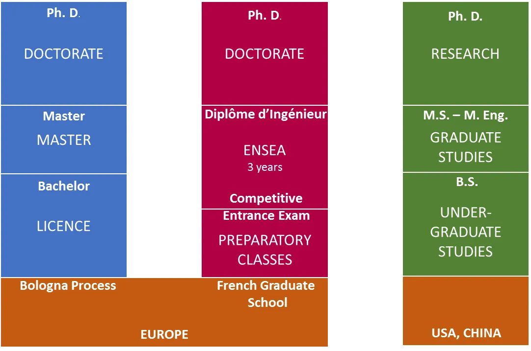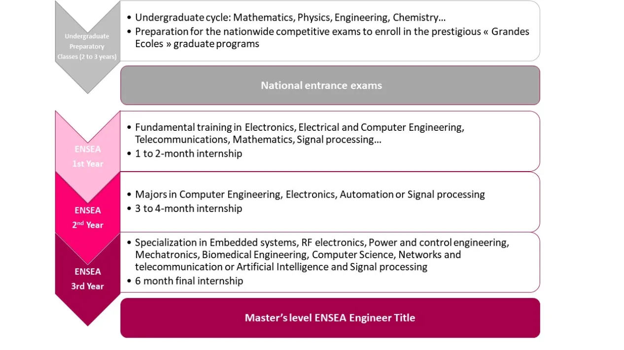 Dans le cadre du système des grandes écoles, le plan d'études général de l'ENSEA suit un cycle de préparation de deux ans et un cycle d'ingénieur de trois ans, comme illustré ci-dessous :
